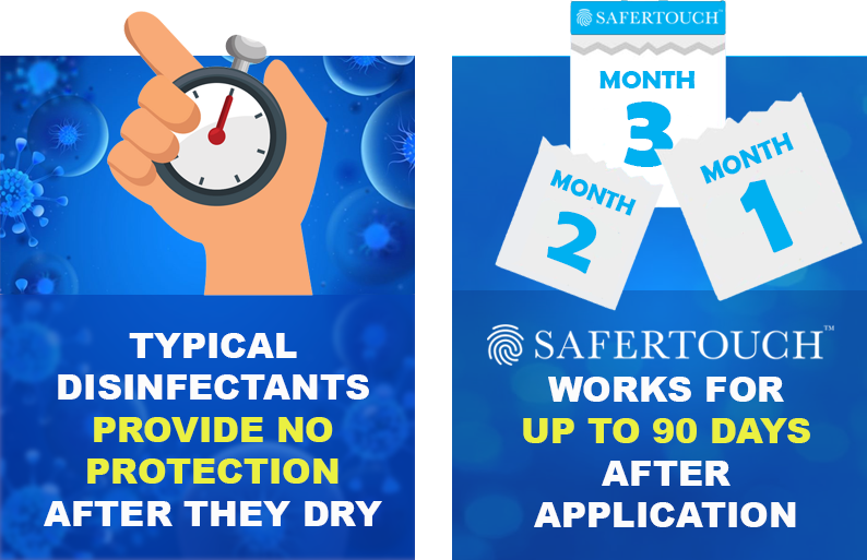 Disinfectants work within minutes but leave no residual activity. SaferTouch works for up to 90 days after application. Set it and forget it for durable and lasting effect.